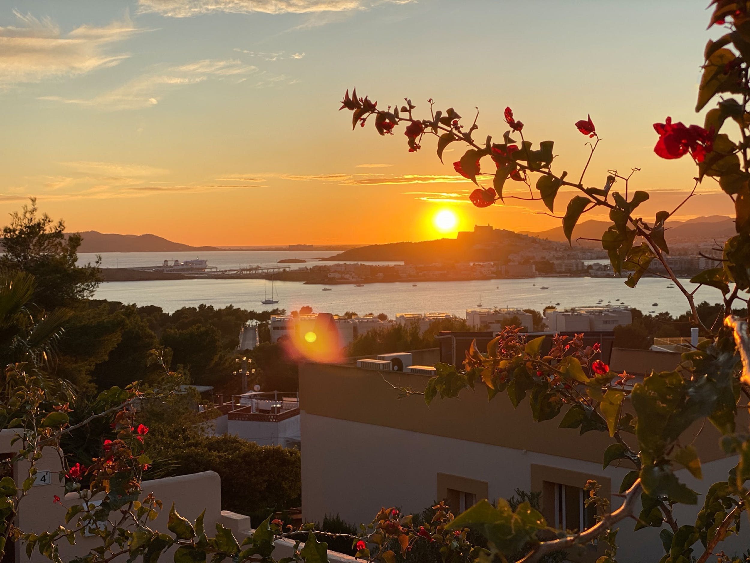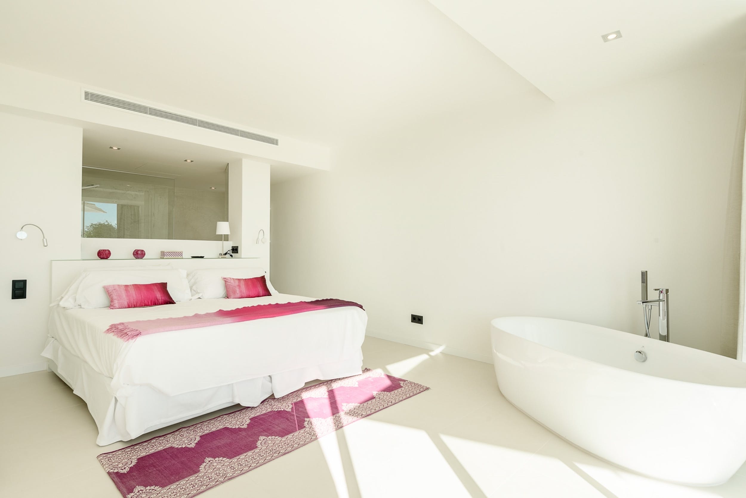The neighbourhood of Can Pep Simo, in which this newly minted Ibiza villa sits, is just a few minutes’ drive from Marina Botafoch, and an eight-minute drive from Ibiza town. Here, you’re just a little further up the hillside from the Destino Pacha Resort, and the golden sands of Talamanca beach are just a short walk away.