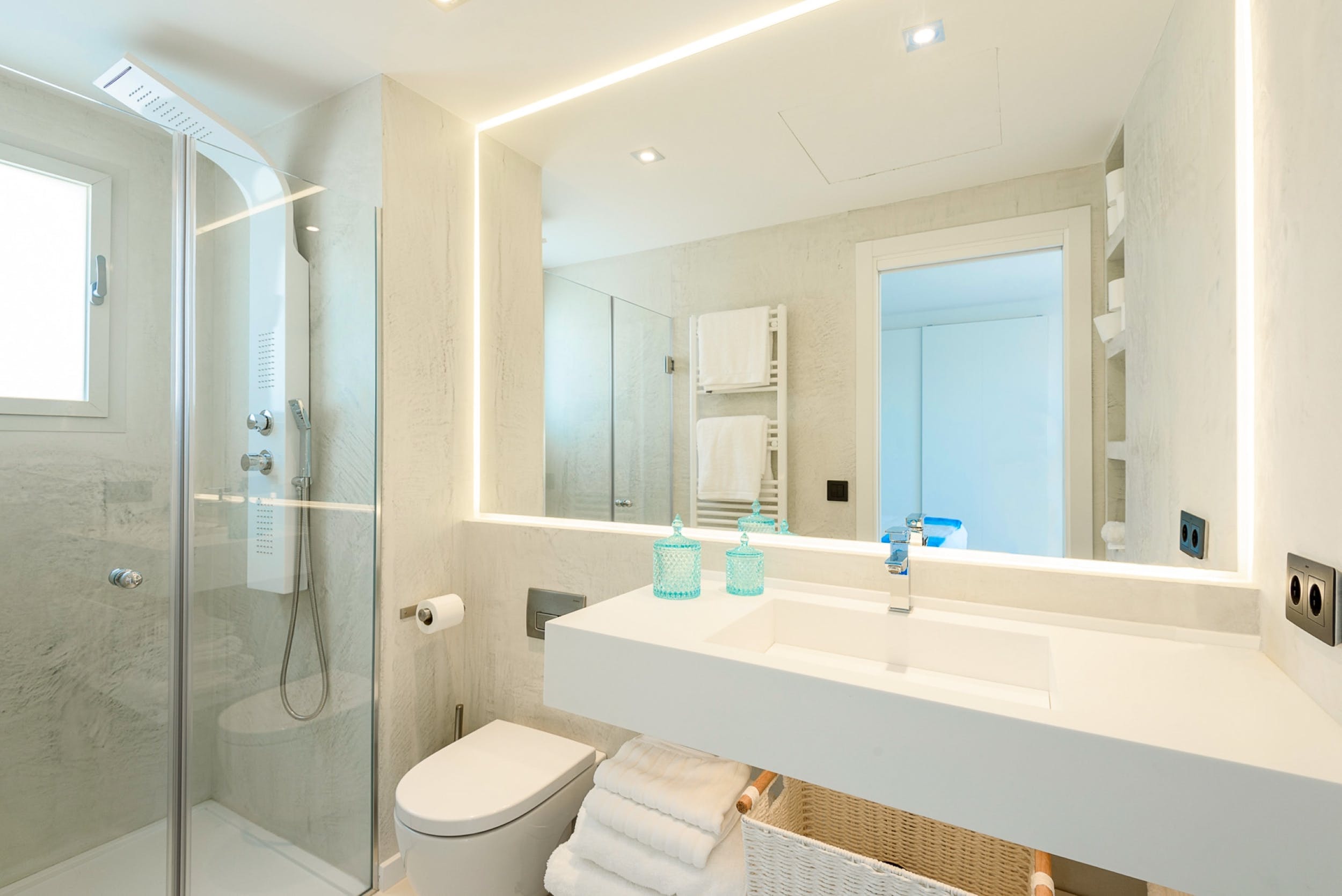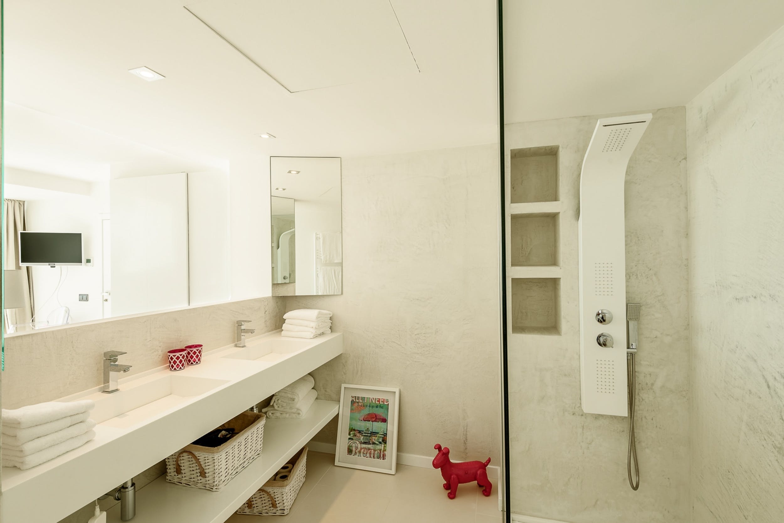 Each of the bedrooms has a private terrace and a smart en-suite bathroom with walk-in shower. The two larger bedrooms also have freestanding bathtubs.
