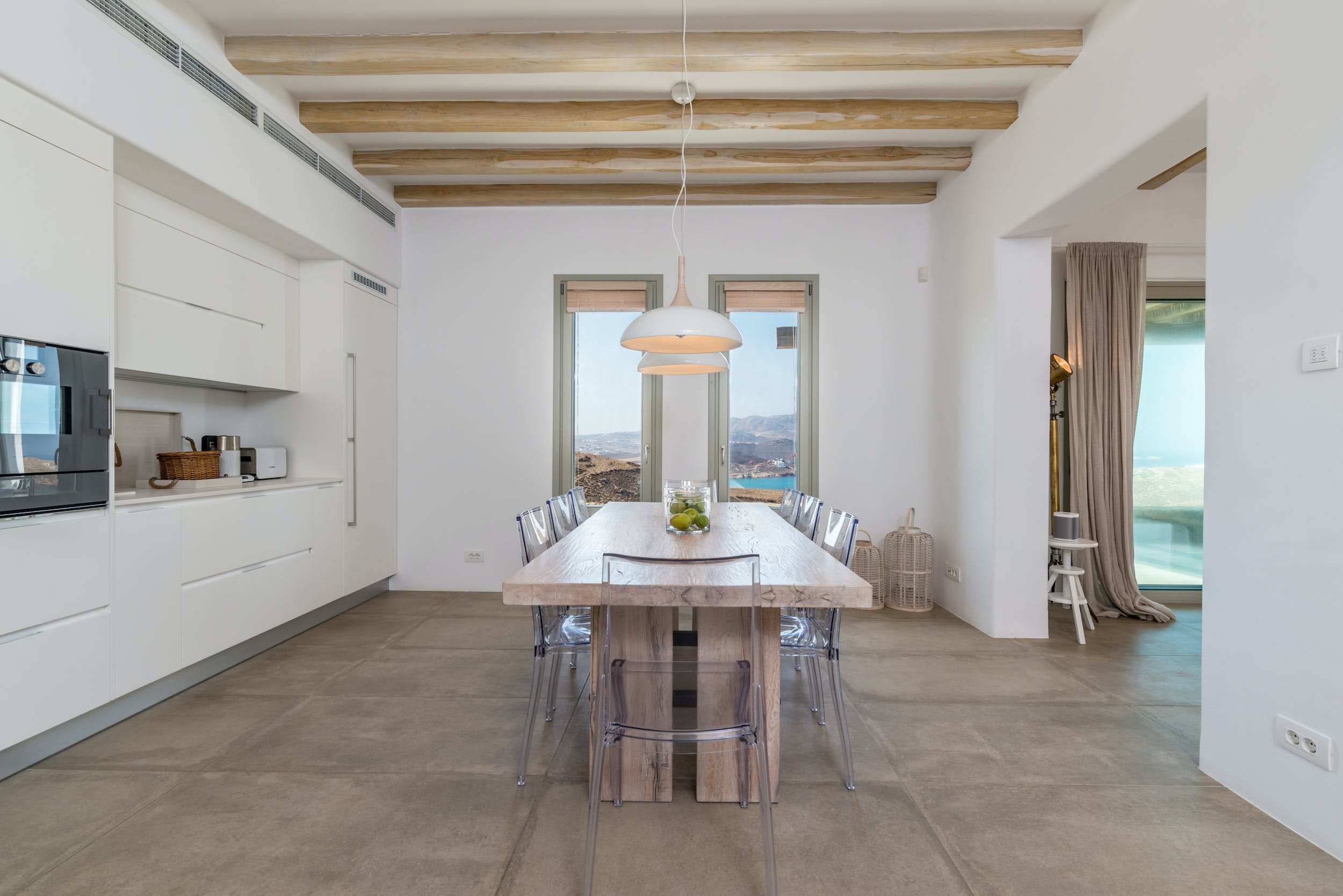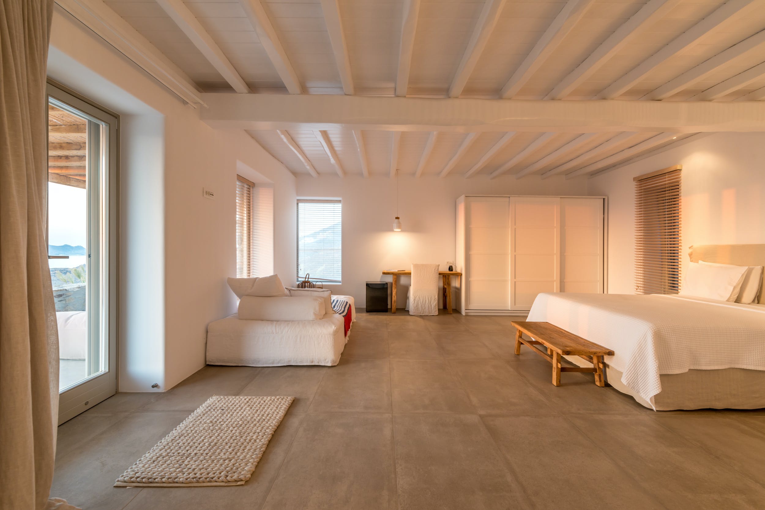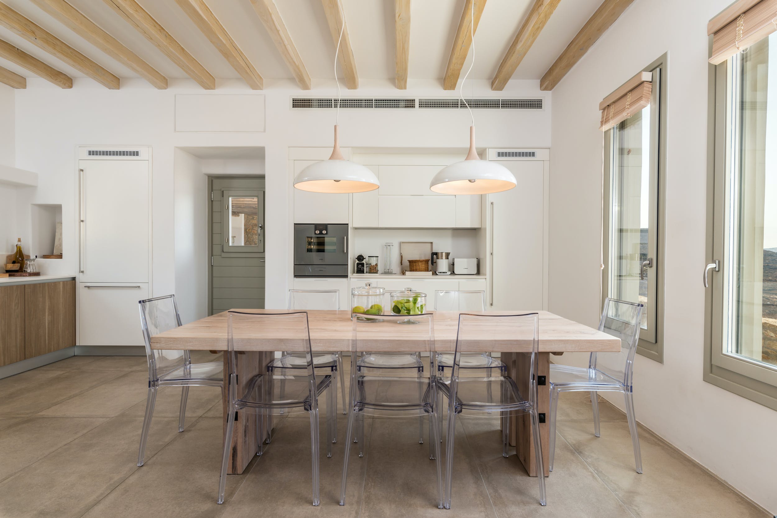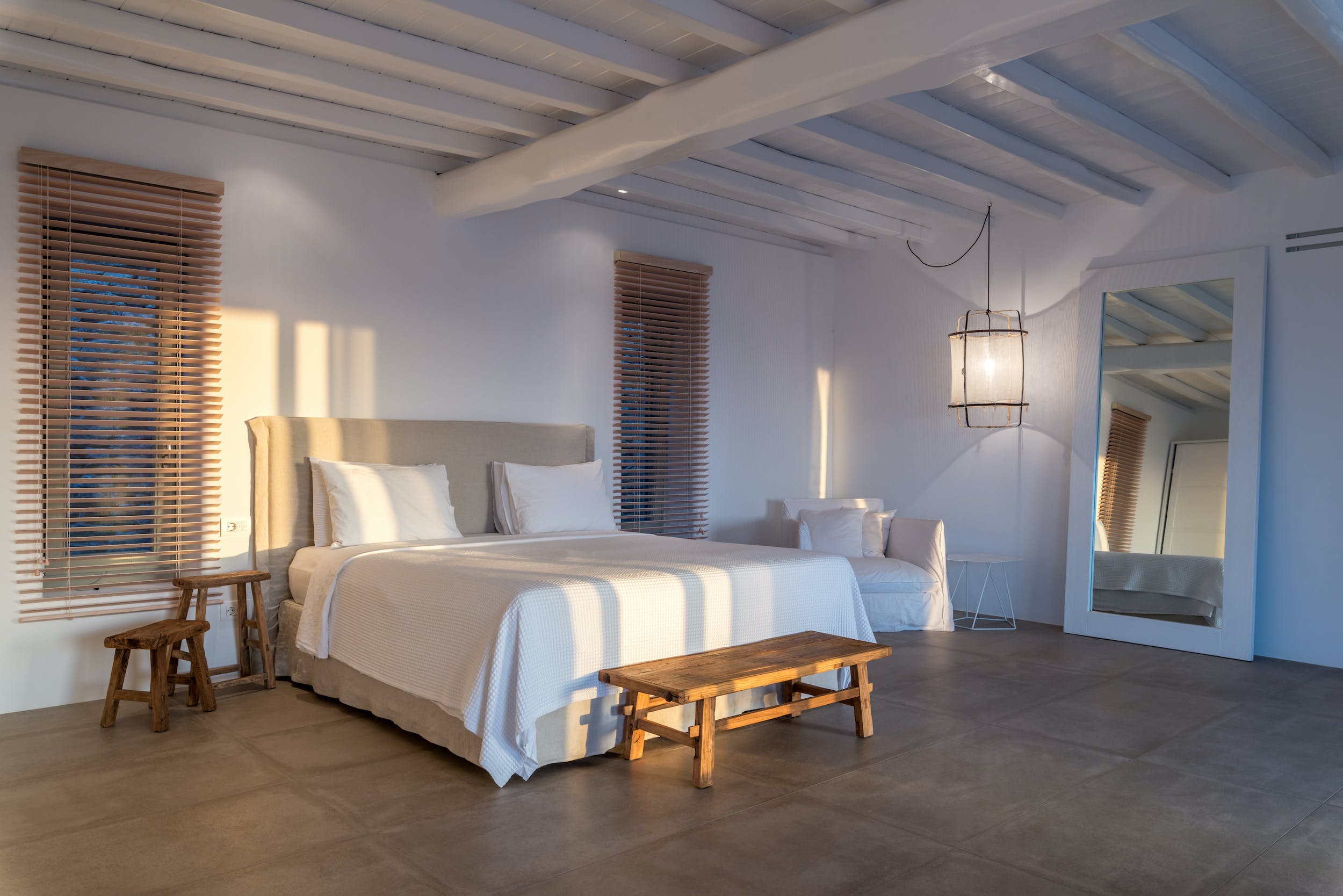 The inside boasts characteristic Mykonos charm: high ceilings, pale wooden rafters, and whitewashed walls – all brought bang up to date with polished cement floors and high-end amenities. Plush sofa seating in neutral tones overlooks the pool terrace and sea views, while the kitchen seamlessly blends glossy white units with natural wood, and a charming breakfast nook, seating eight.