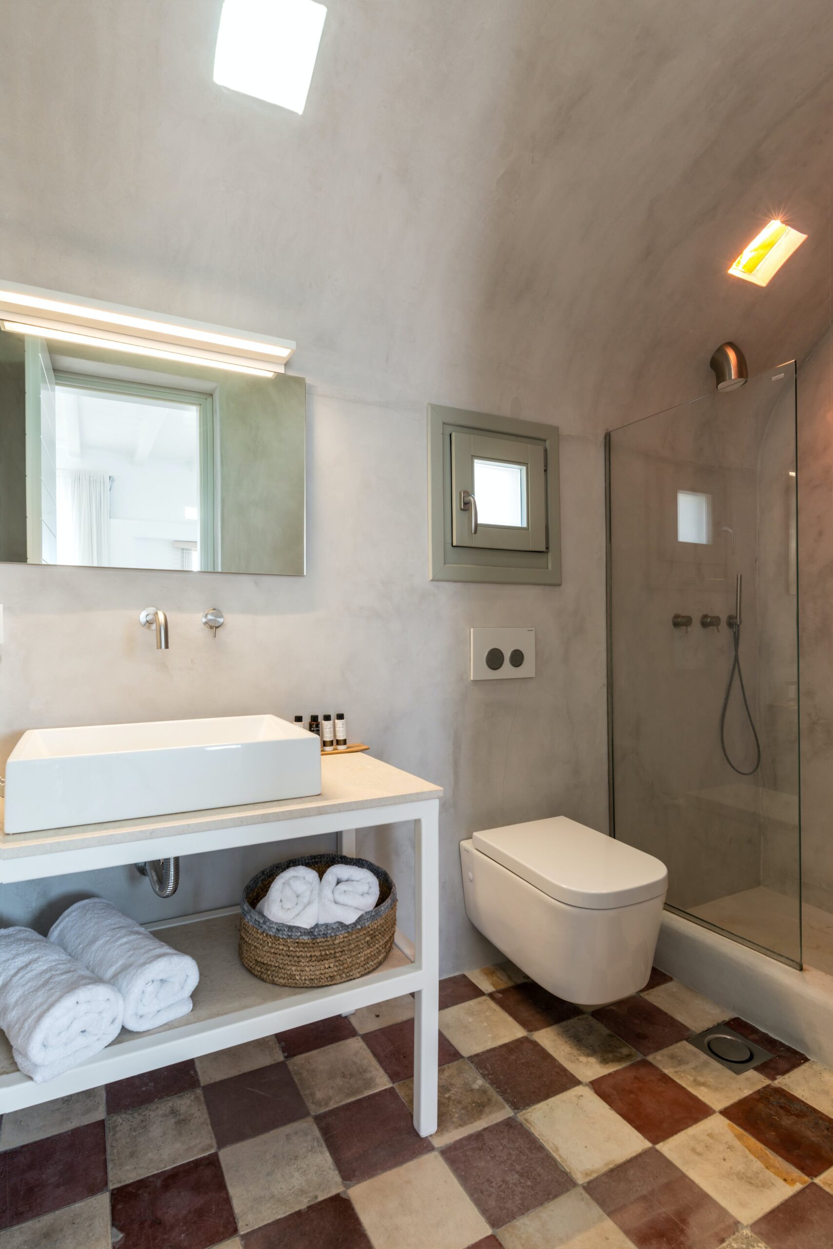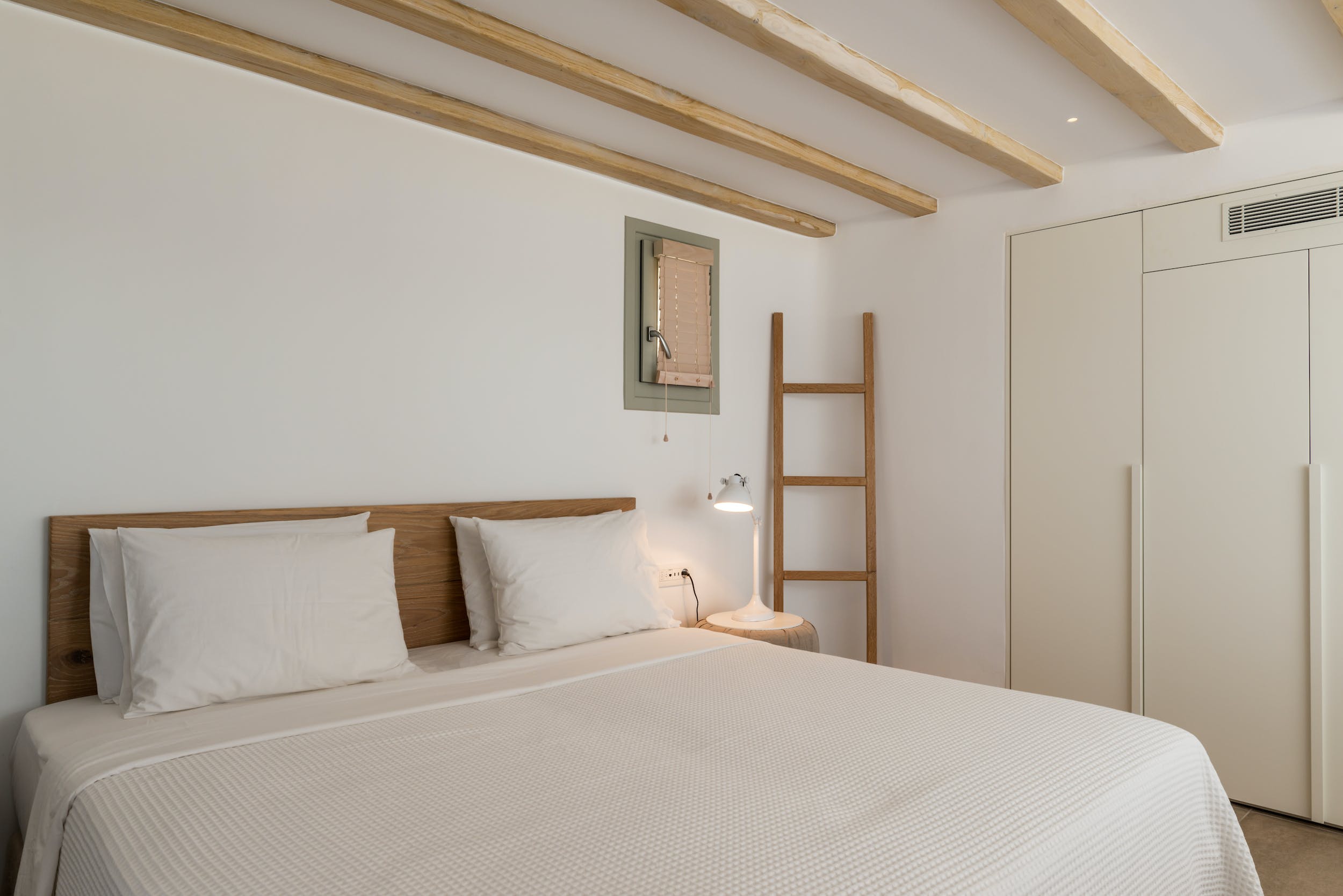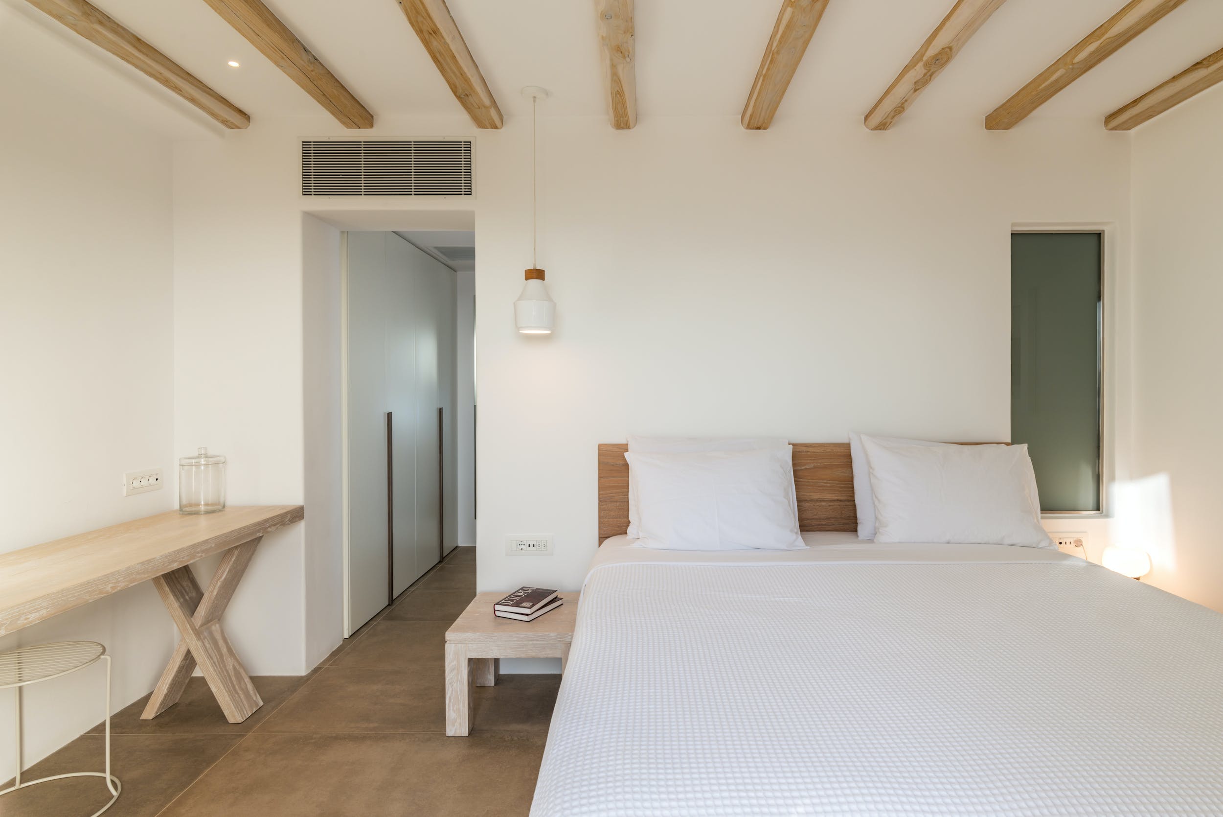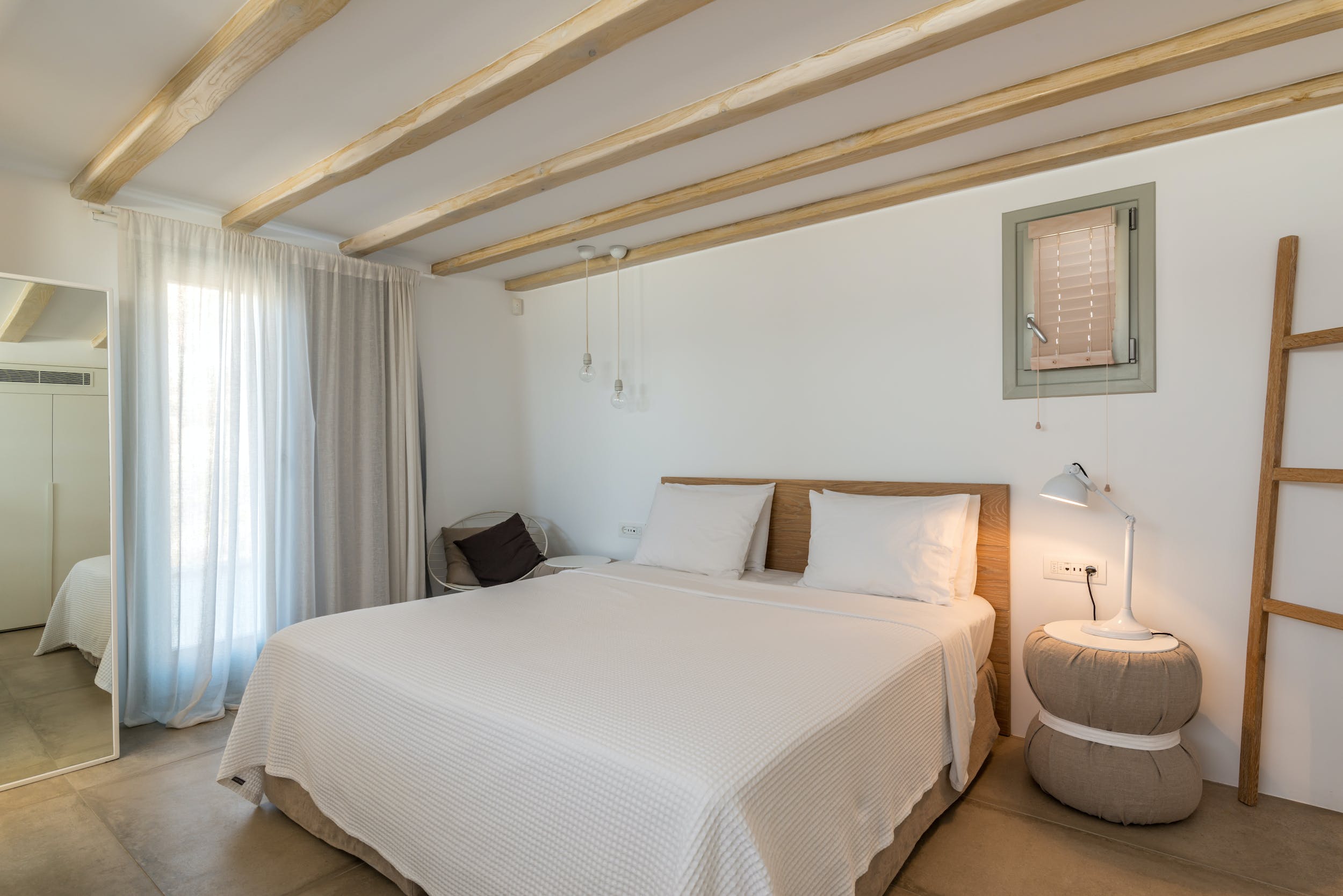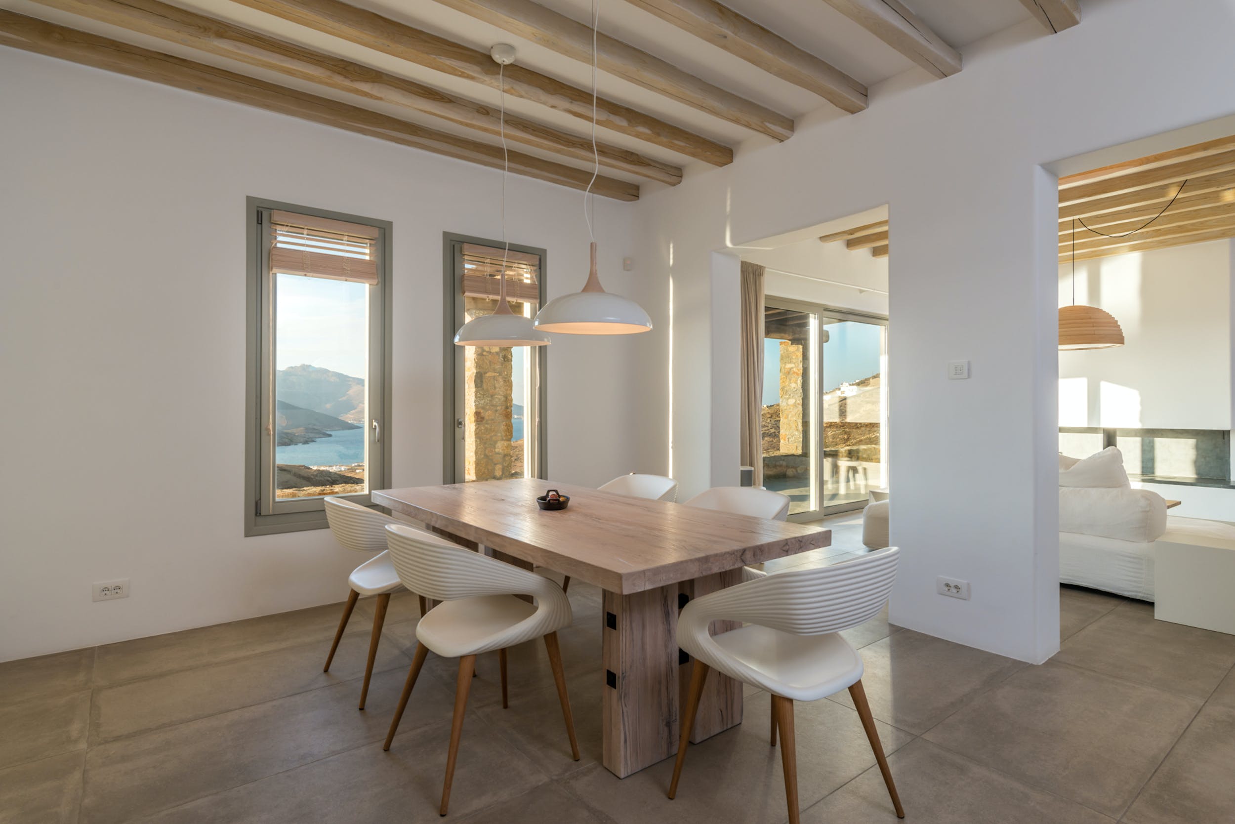 The inside boasts characteristic Mykonos charm: high ceilings, pale wooden rafters, and whitewashed walls – all brought bang up to date with polished cement floors and high-end amenities. Plush sofa seating in neutral tones overlooks the pool terrace and sea views, while the kitchen seamlessly blends glossy white units with natural wood, and a charming breakfast nook, seating eight.