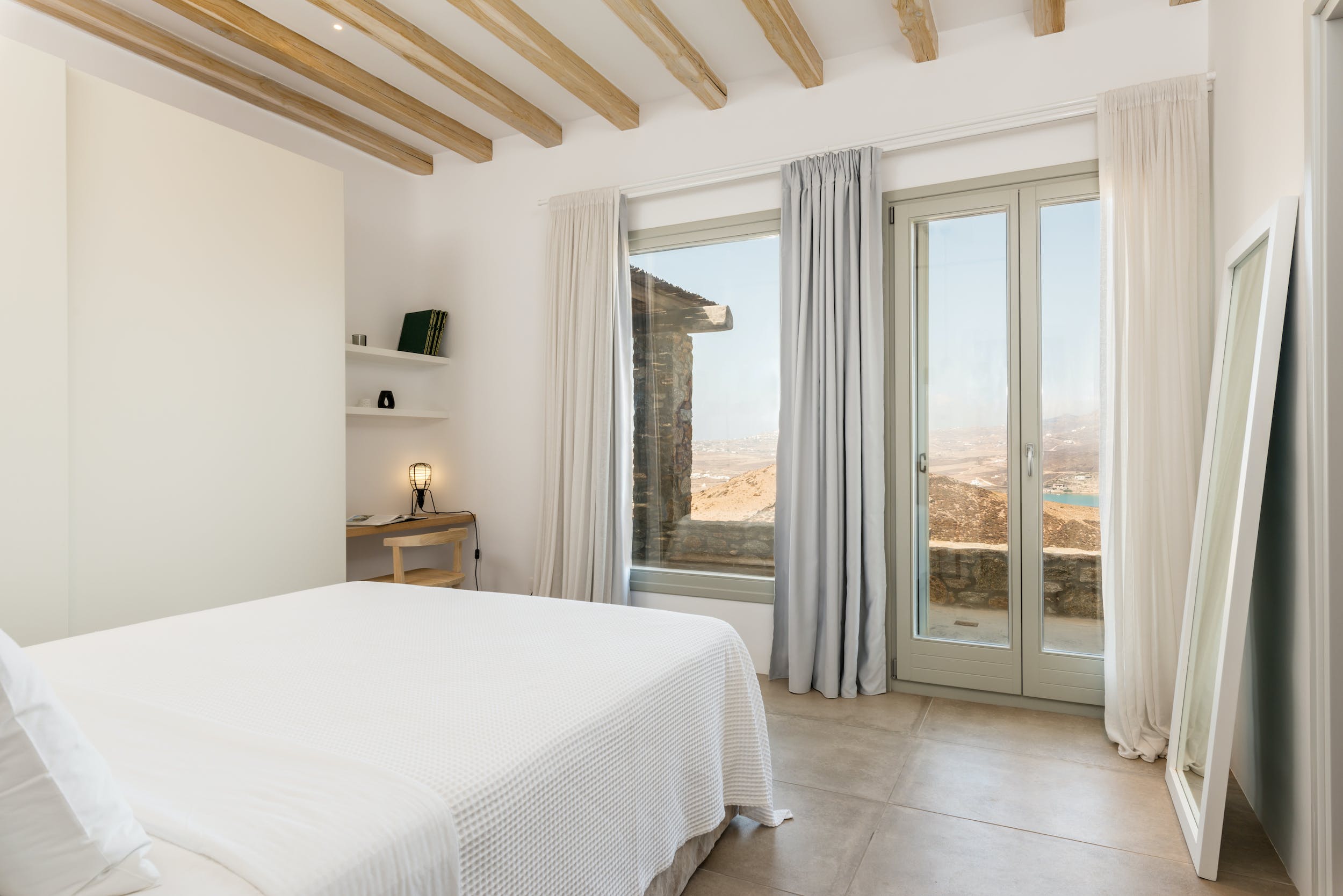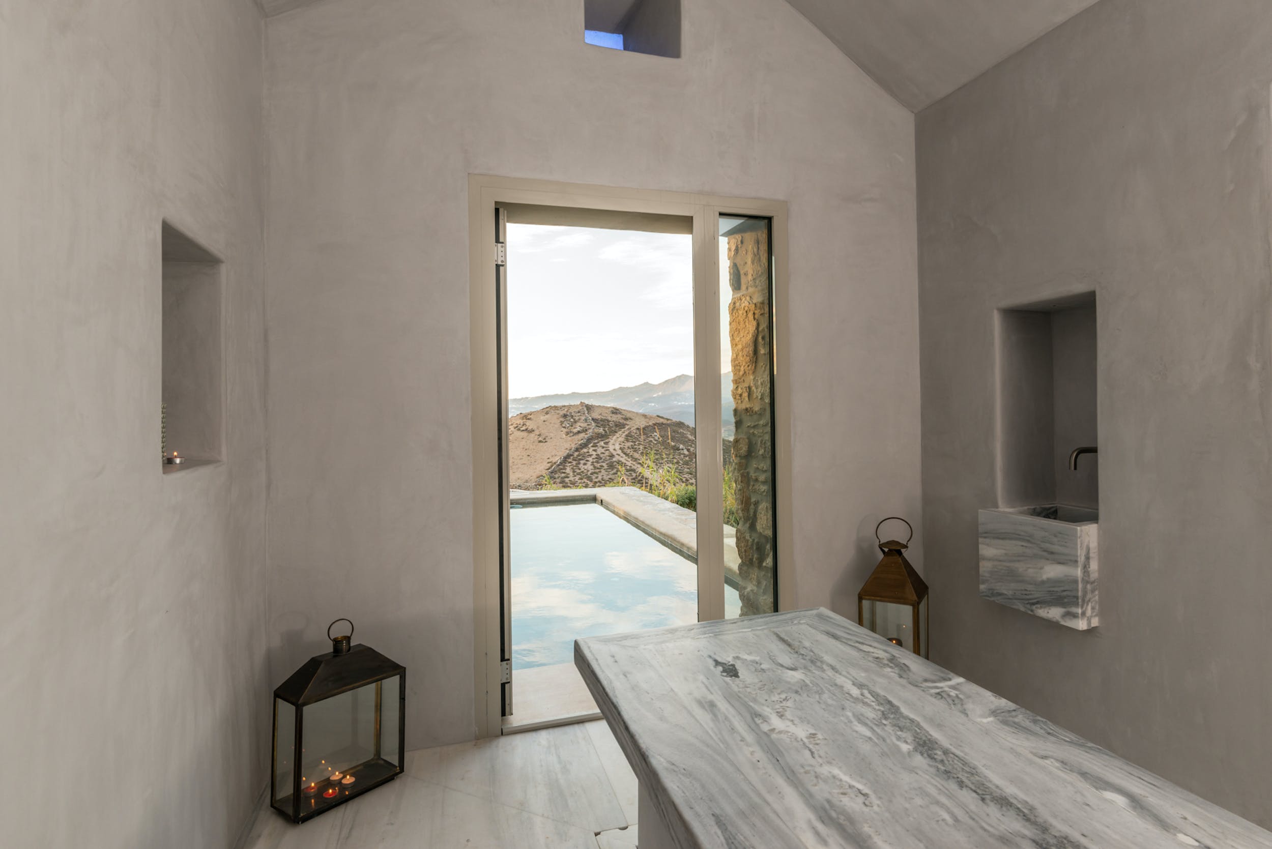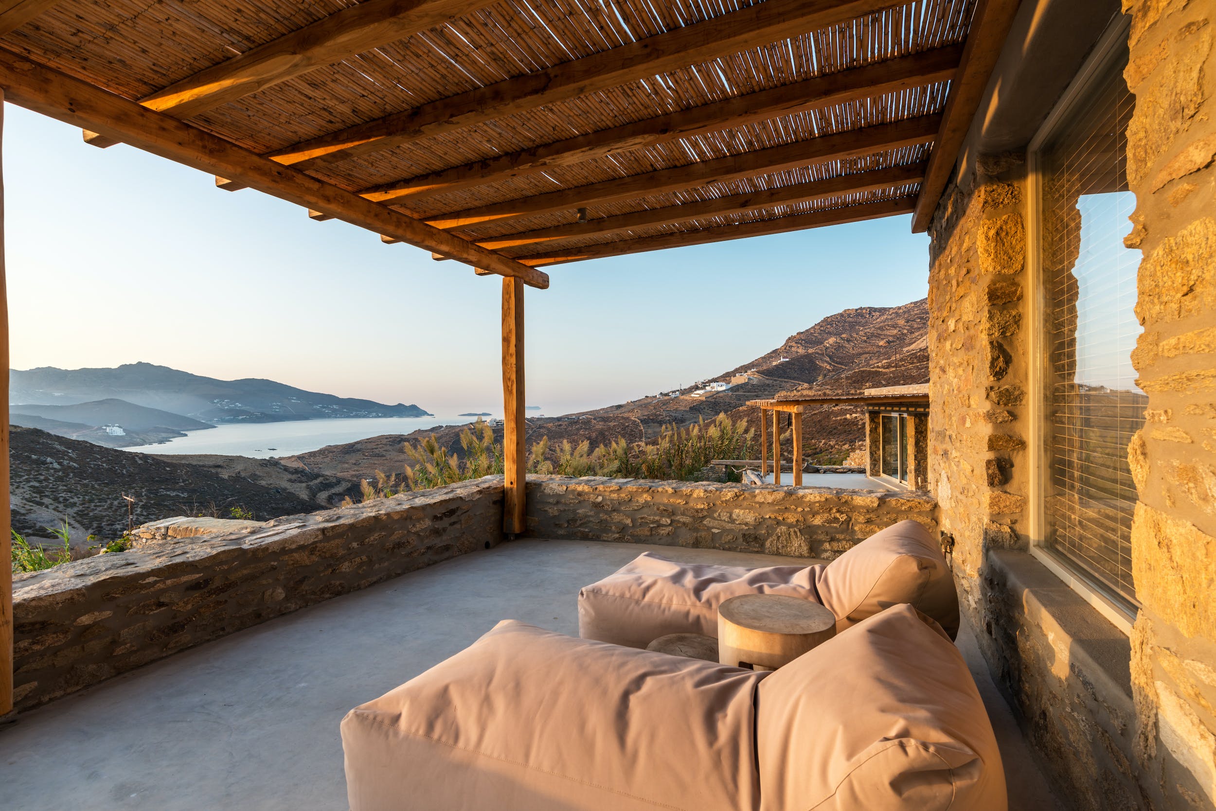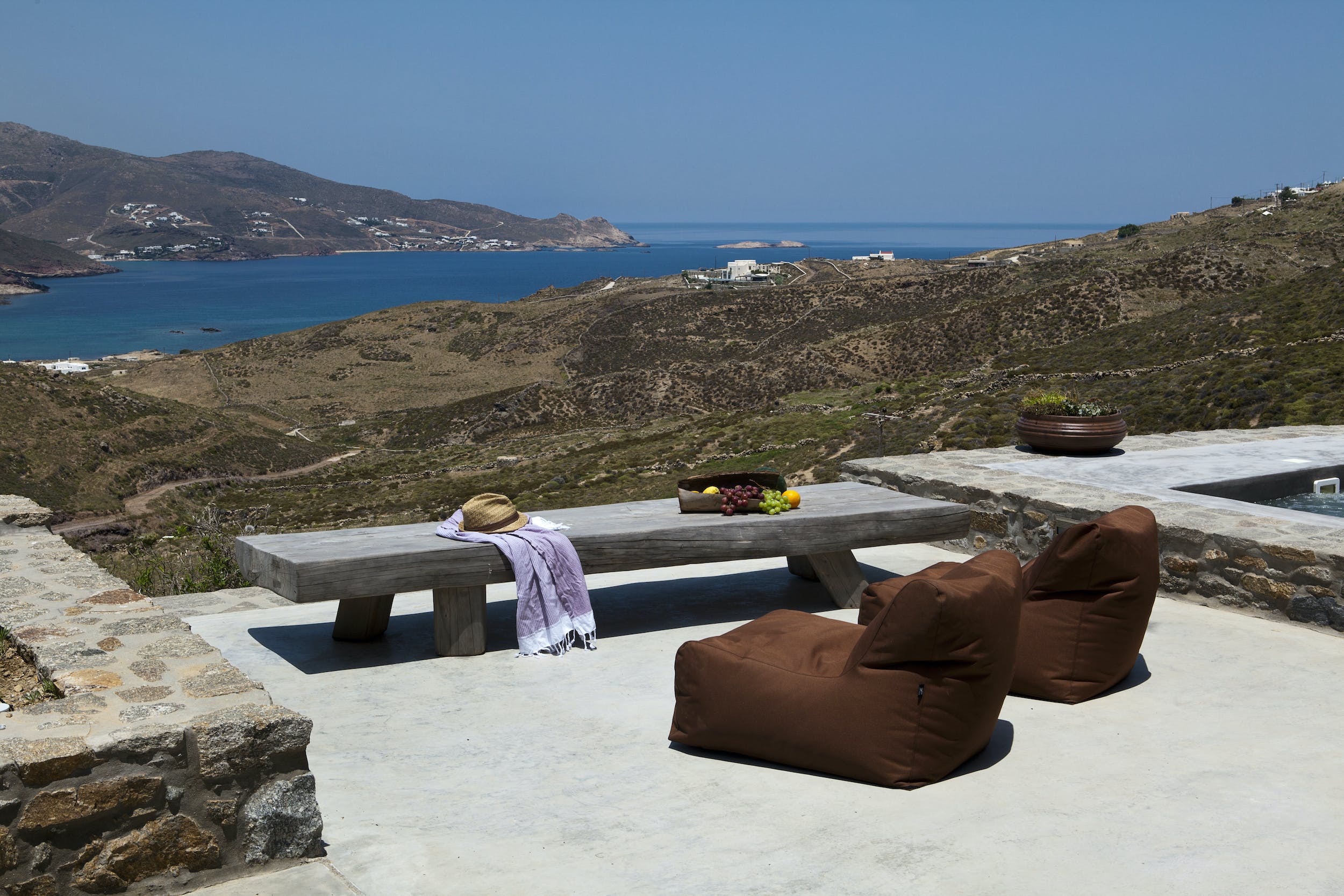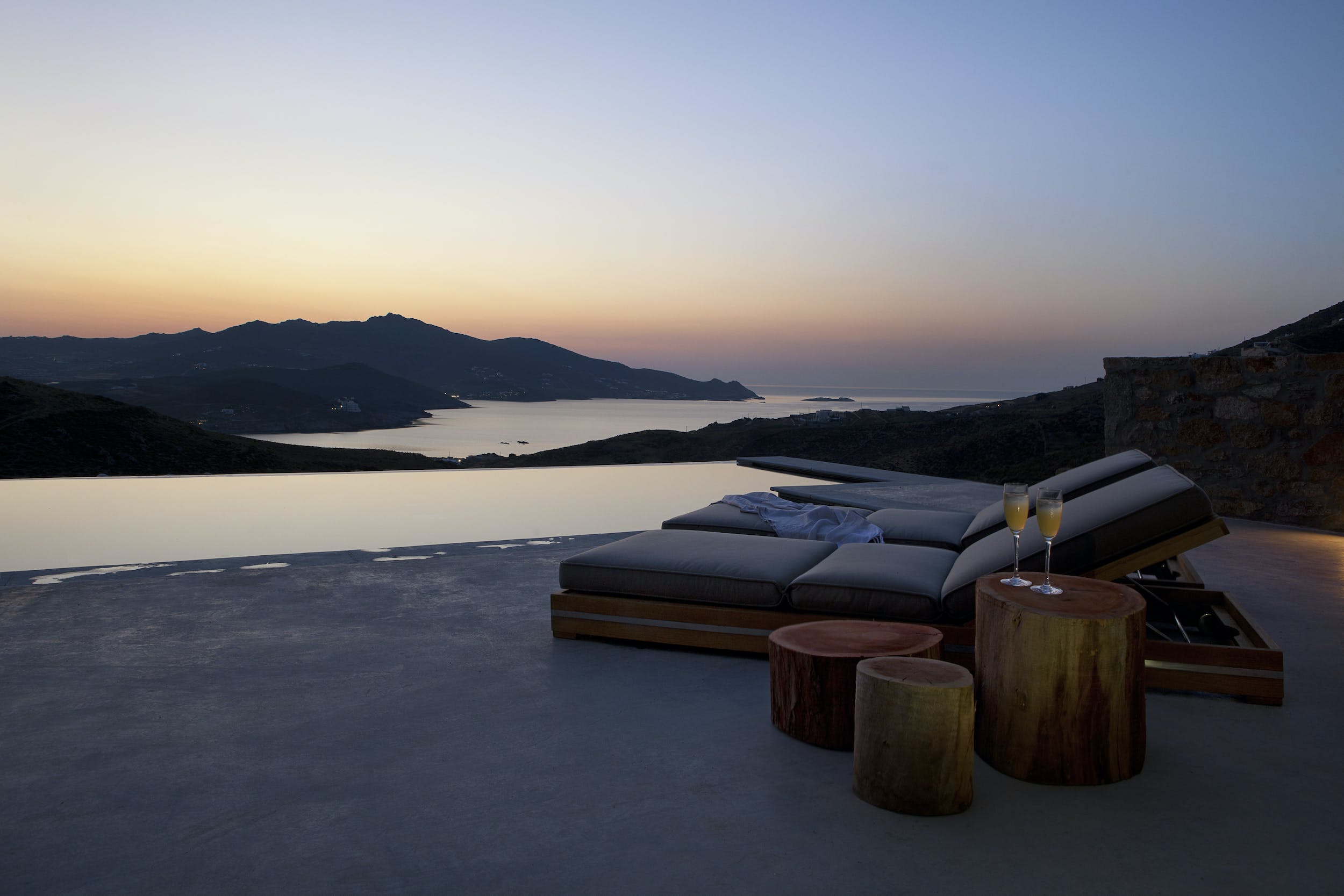 The natural stone walls and sleek white render of Villa Delano create a charming, rustic ambience which blends seamlessly with the surrounding rocky hillside. In front of the property, the beautiful infinity pool seems to hover above the headland, the shimmering Aegean waters dazzling on the horizon.